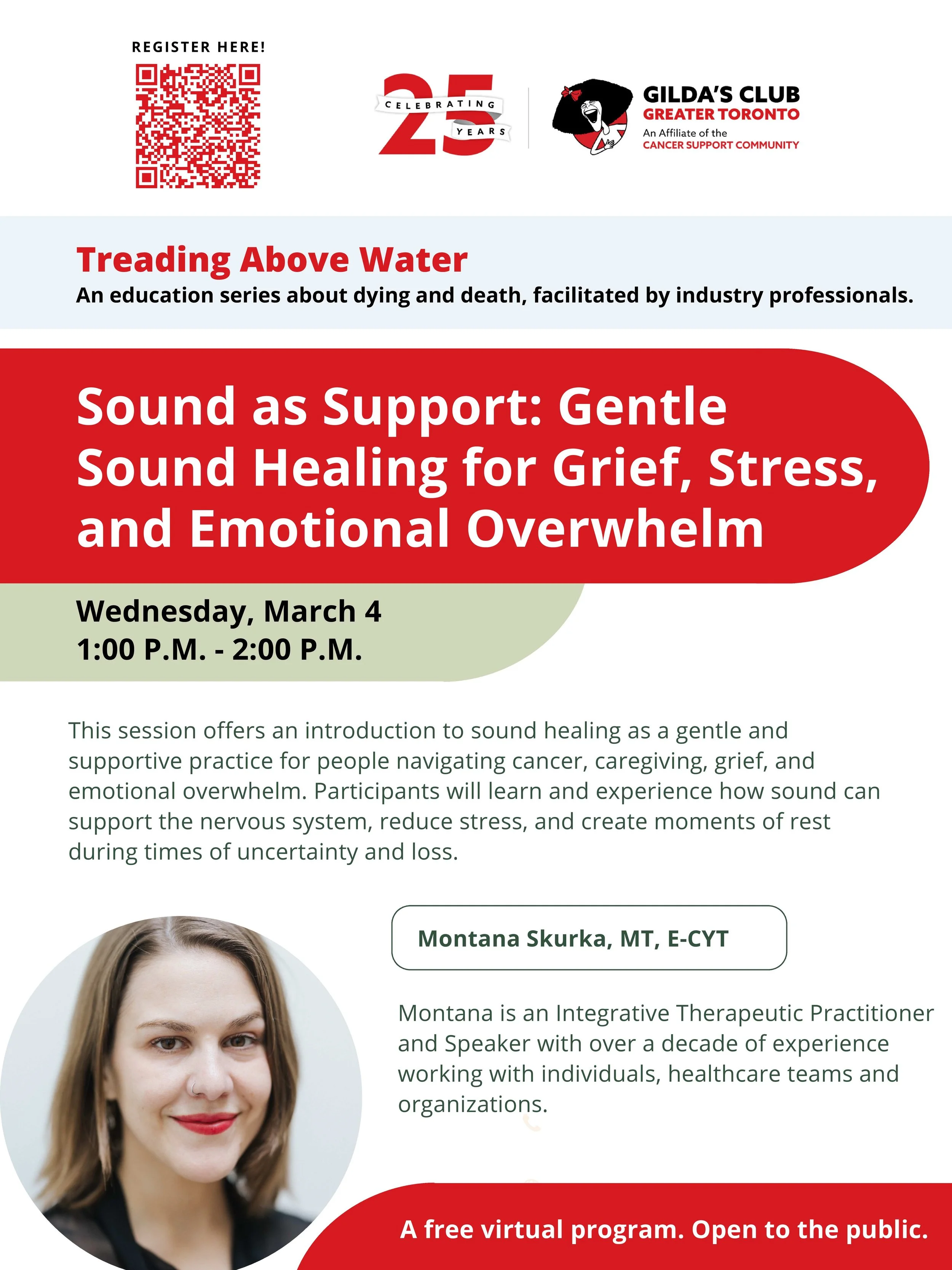I am honoured & looking forward to facilitating an upcoming free session in collaboration with Gilda’s Club, taking place online on Wednesday, March 4th from 1:00 - 2:00 PM EST. This educational and experiential workshop is part of the Treading Above Water initiative, a series about death and dying.